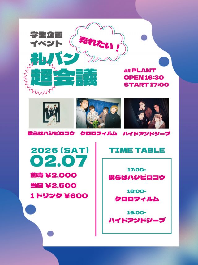 出演:僕らはハシビロコウ、クロロフィルム、ハイドアンドシープ 料金...
